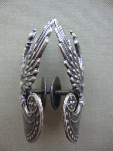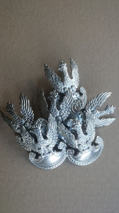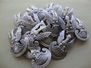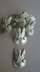 Orzełek wz. 19 do czapki garnizonowej „wyprofilowany”- mocowanie gwintowany słupek z nakrętką – kolory : srebrny , mosiądz i spatynowany mosiądz .